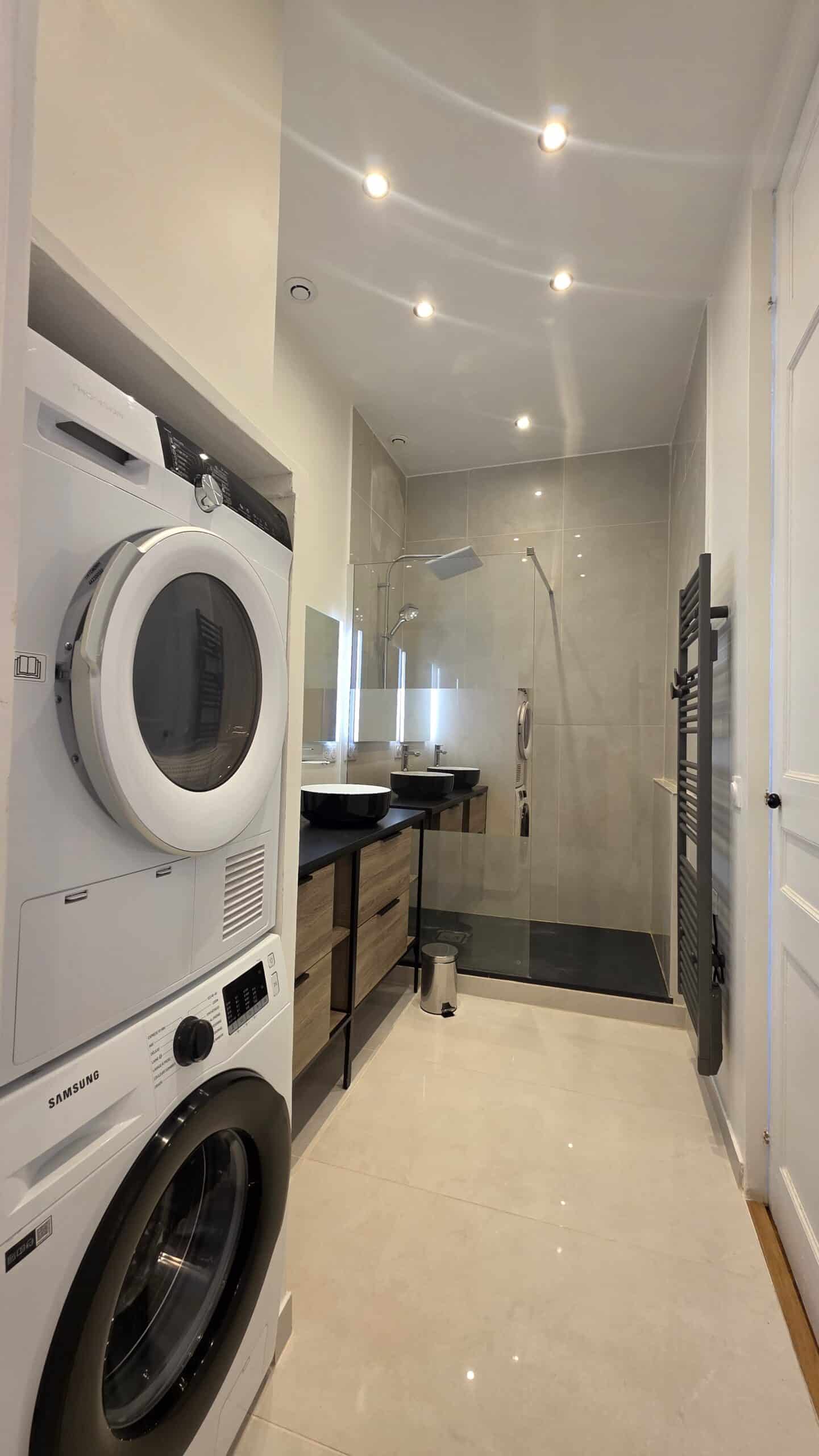 – spacieuse salle d’eau avec douche italienne, lave-linge et sèche-linge, accessible par le couloir ou par la chambre 1.