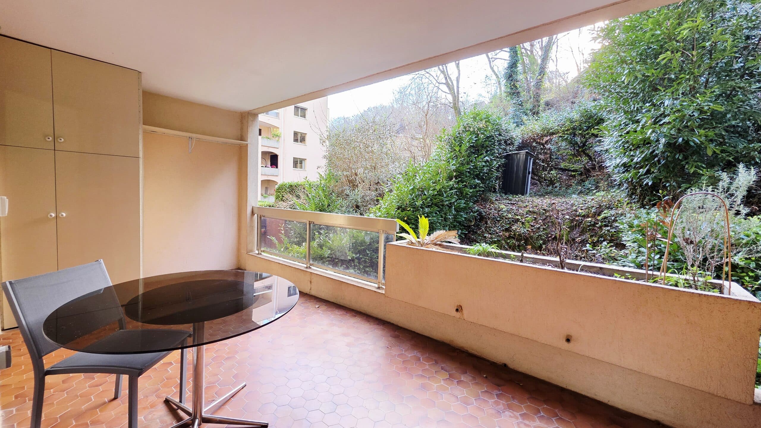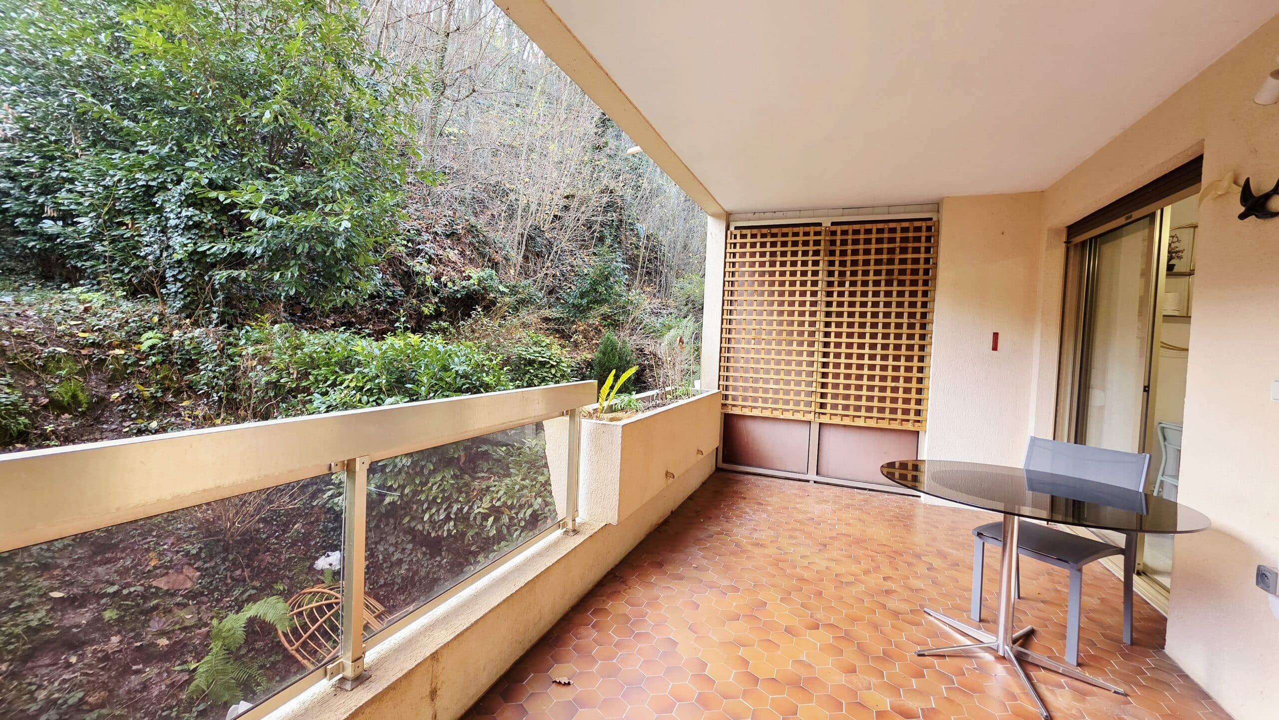 Accès au grand balcon au calme, sans vis-à-vis, avec vue sur une colline arborée.