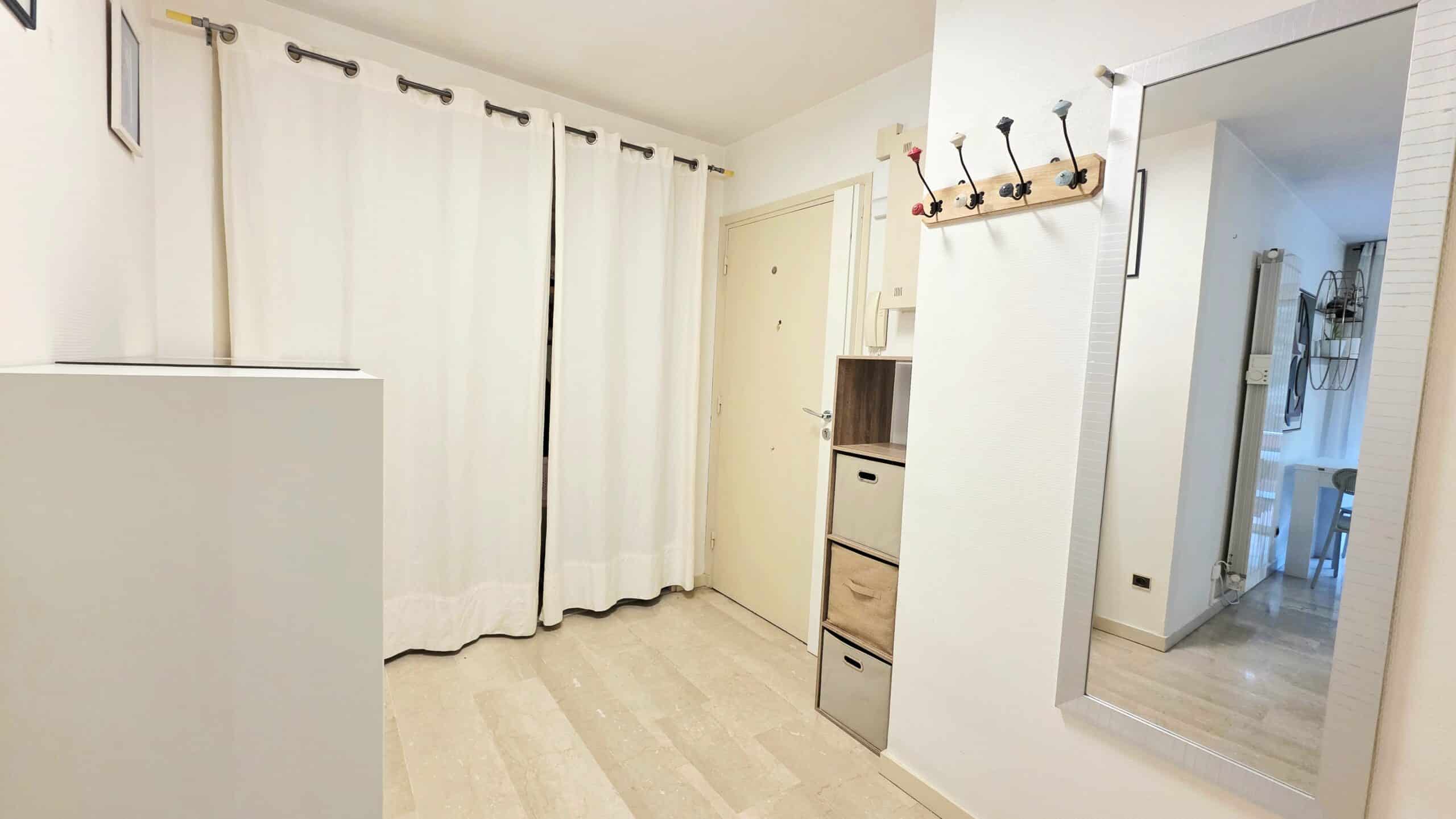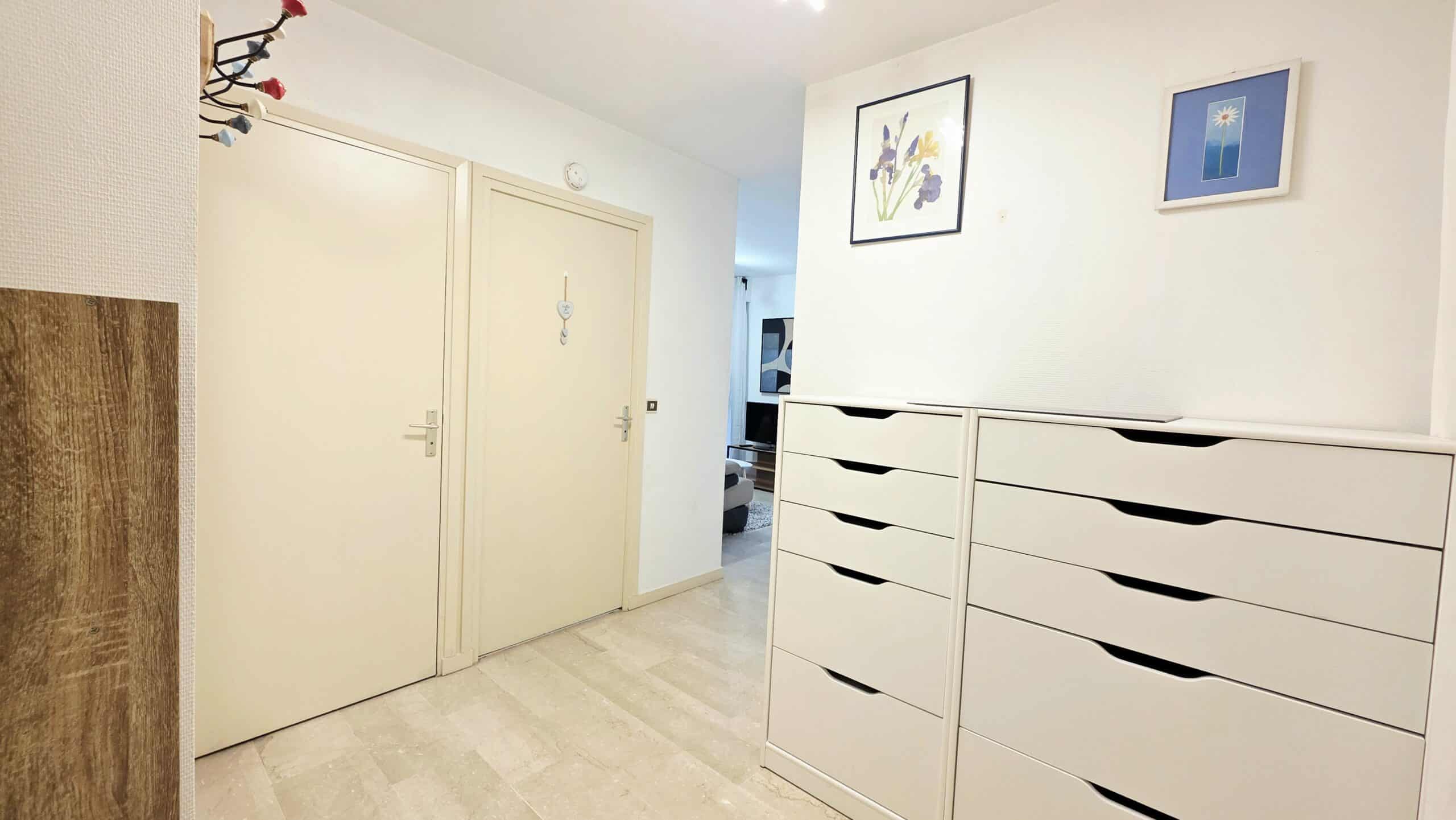 Une entrée avec de nombreux rangements (penderie, commode et étagères)