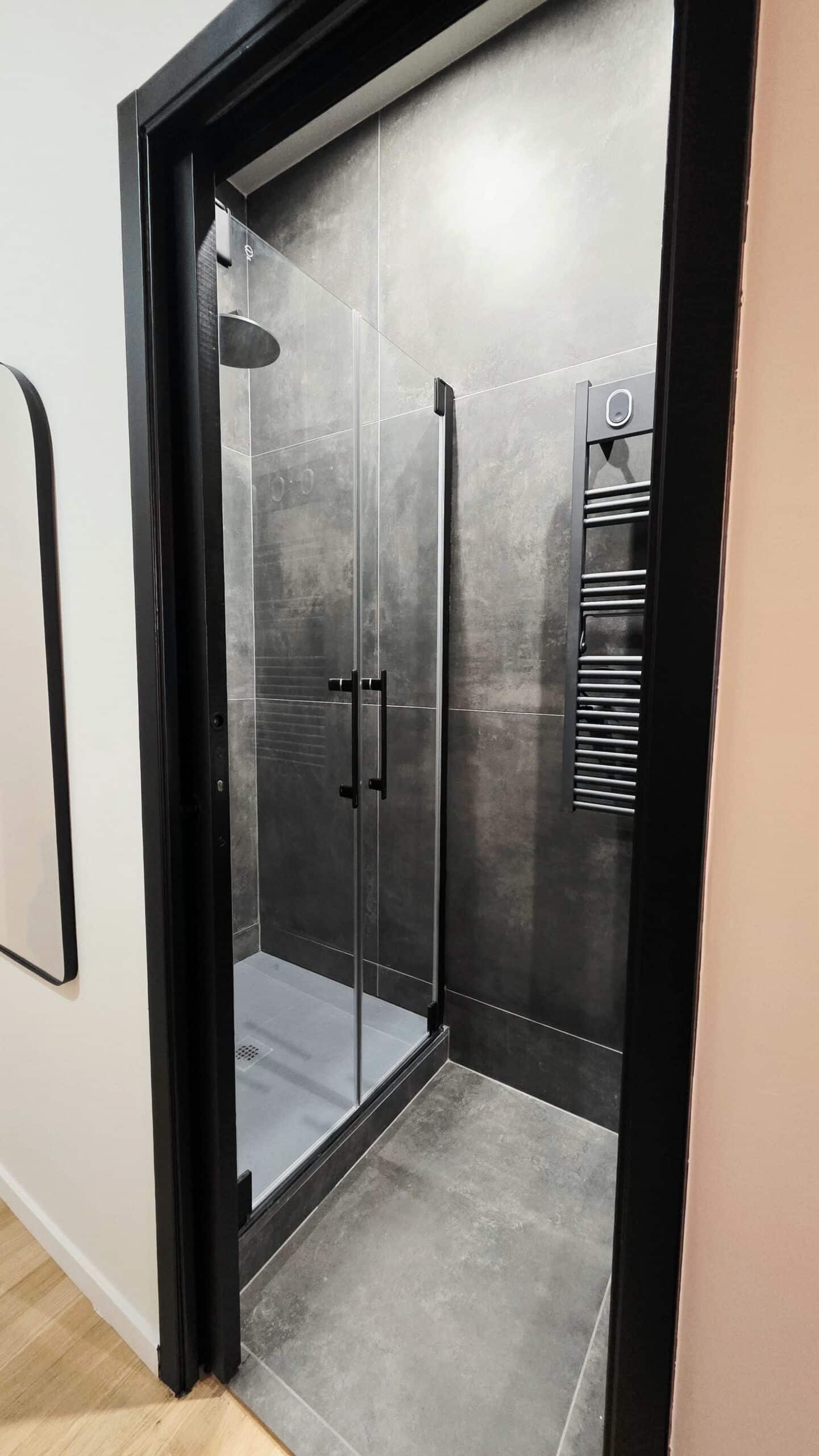 – une salle d’eau moderne, équipée d’une douche, vasque sur meuble.