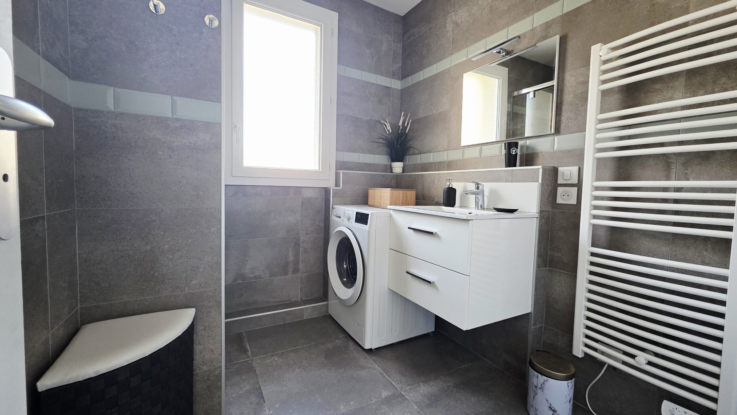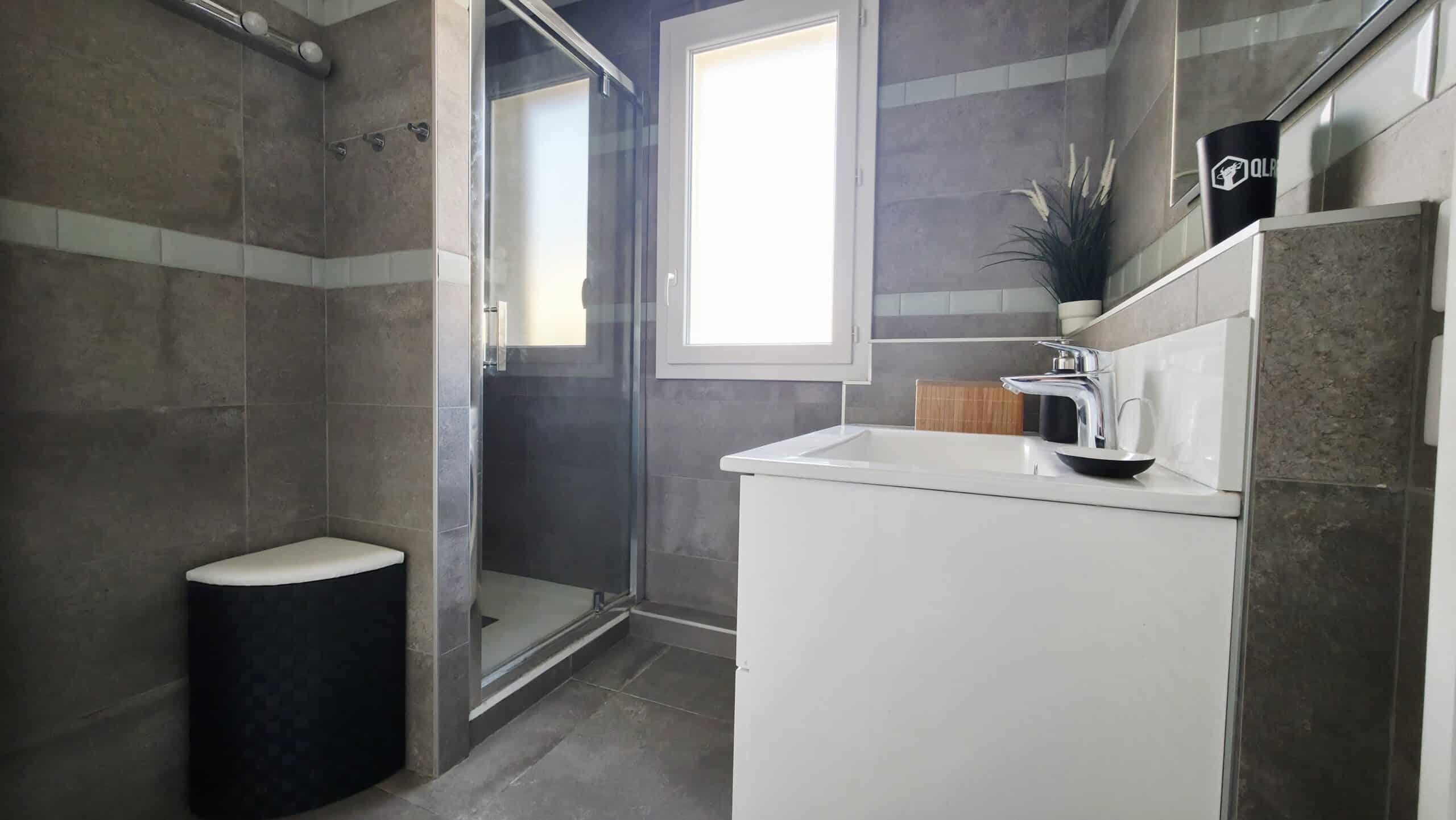 – salle d’eau avec cabine de douche, vasque sur meuble